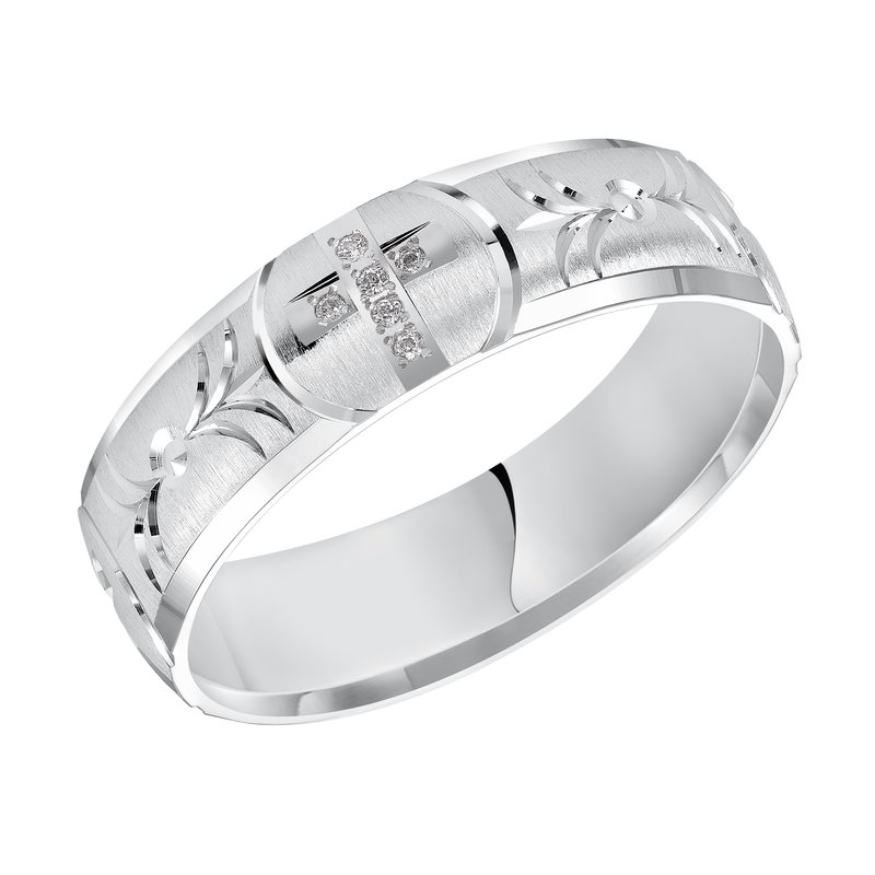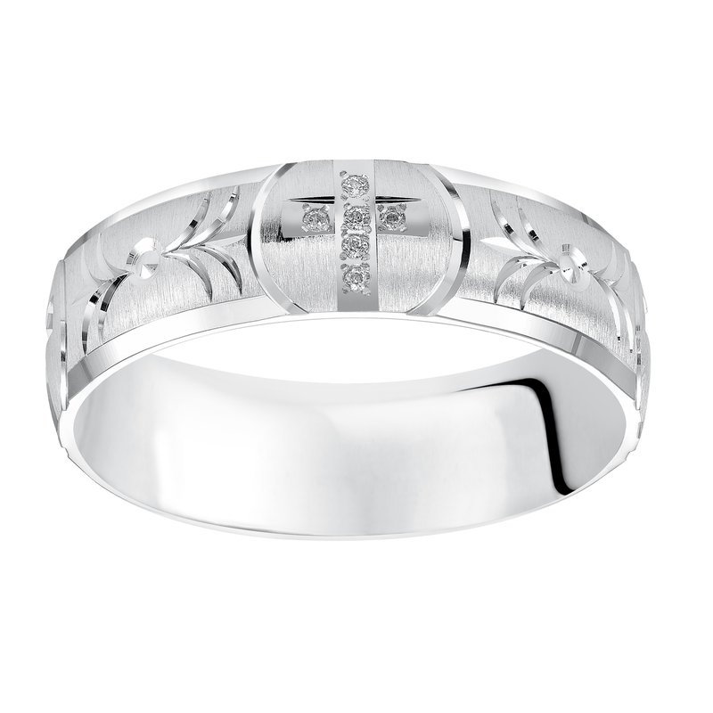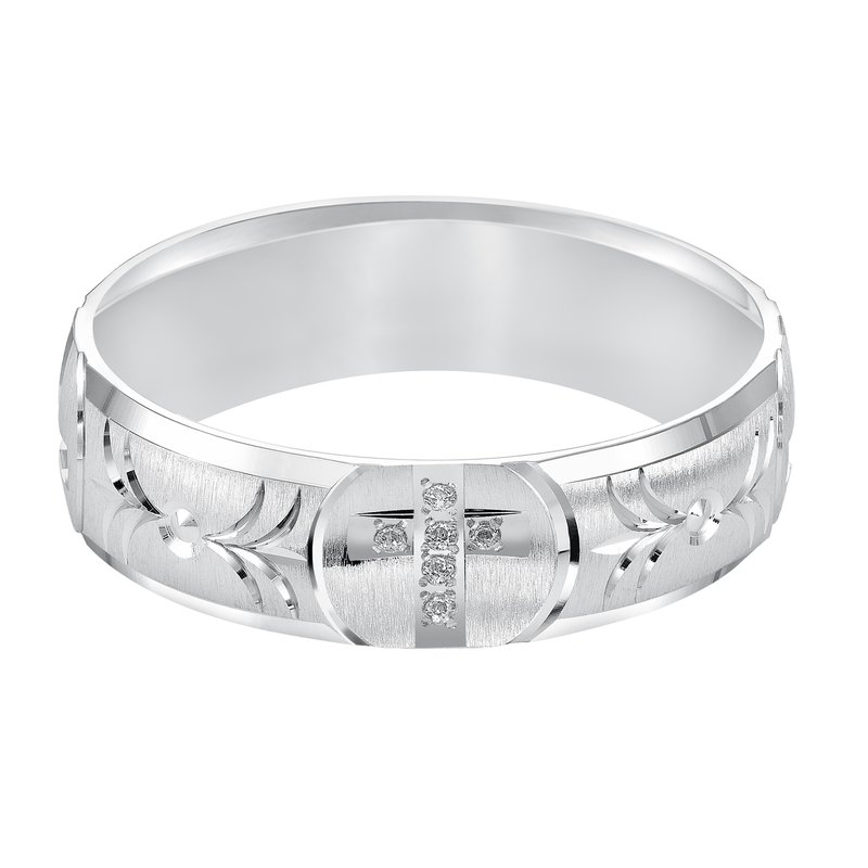 Set to perfection, an exquisite diamond cross enhances this Comfort Fit, wedding band with bright cuts, a vertical satin finish and beveled edge