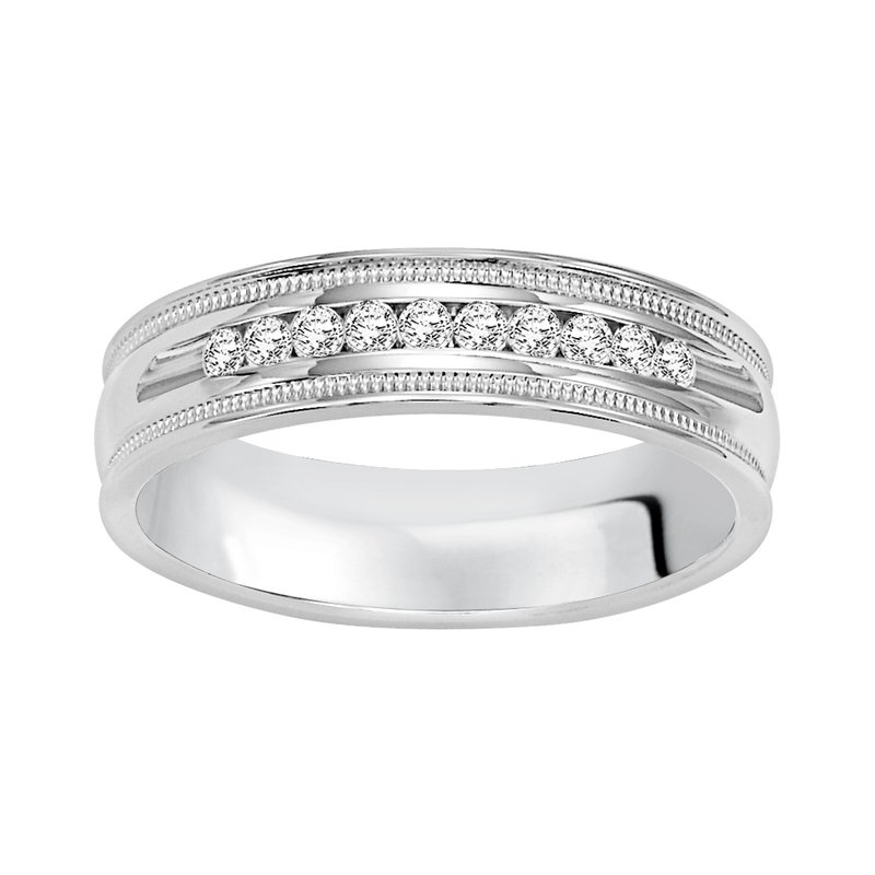 Traditional milgrain paired with a modern, bright finish, round edges and 10 stone channel set diamonds are the perfect combination for this exquisite, Comfort Fit, wedding band
