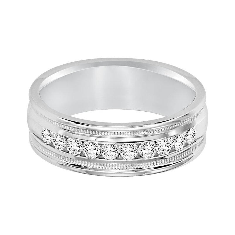 Traditional milgrain paired with a modern, bright finish, round edges and 10 stone channel set diamonds are the perfect combination for this exquisite, Comfort Fit, wedding band