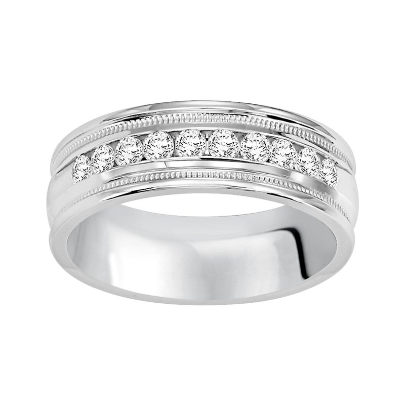 Traditional milgrain paired with a modern, bright finish, round edges and 10 stone channel set diamonds are the perfect combination for this exquisite, Comfort Fit, wedding band