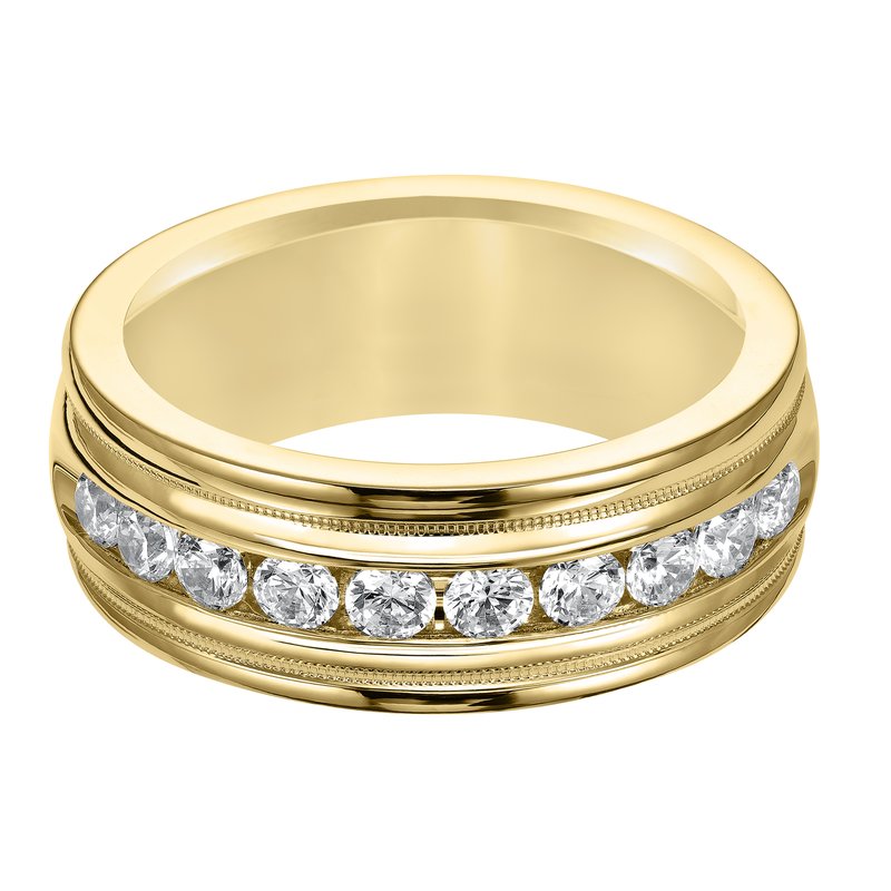 Traditional milgrain paired with a modern, bright finish, round edges and 10 stone channel set diamonds are the perfect combination for this exquisite, Comfort Fit, wedding band
