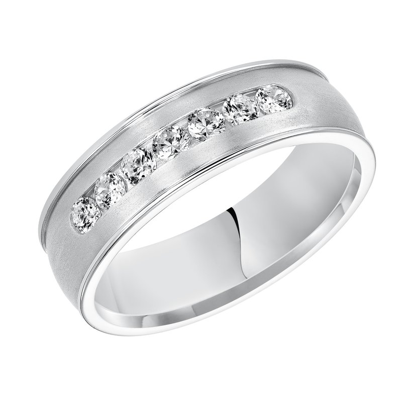 Distinct yet timeless, this low-domed, Comfort Fit, 7 stone diamond wedding band features satin finish with round edges