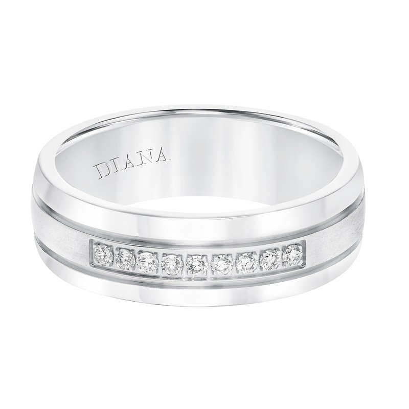Men's diamond wedding band with satin finish, and low dome with flat edges.