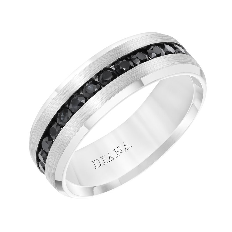 Men's Band with Single Row All Around Black Sapphires, Domed Brushed Finish and Bright Beveled Edge