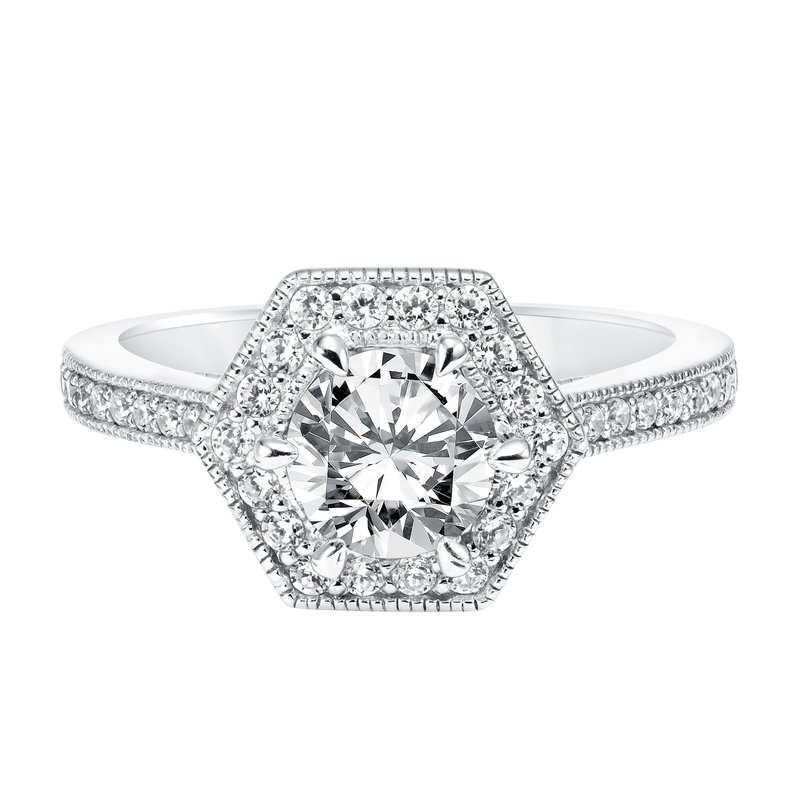 Diamond Halo Engagement Ring with Diamond Shank and Milgrain Detail