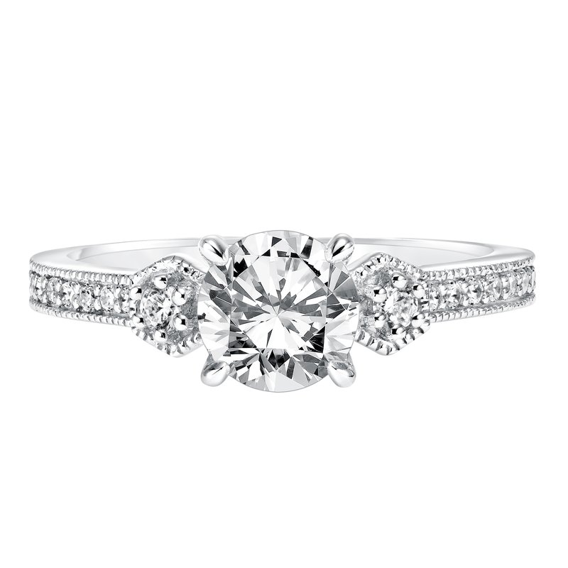 Three Stone Diamond Engagement Ring with Diamond Shank and Milgrain Detail