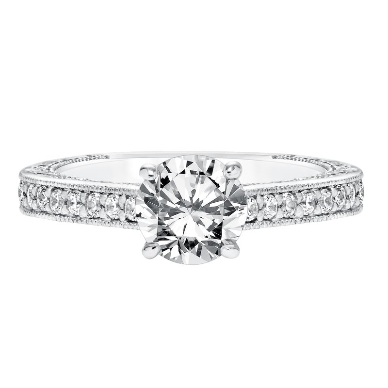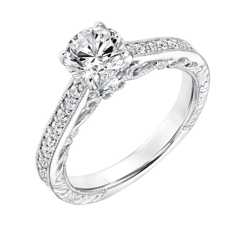 Diamond Prong set Engagement Ring with Engraved Diamond Shank Filigree and Milgrain Detail