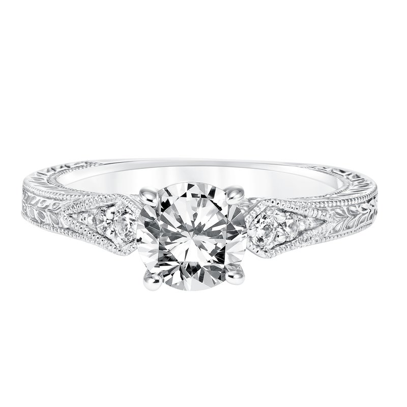 Diamond Prong Set Engagement Ring with Pinched Diamond Engraved Shank and Milgrain Detail