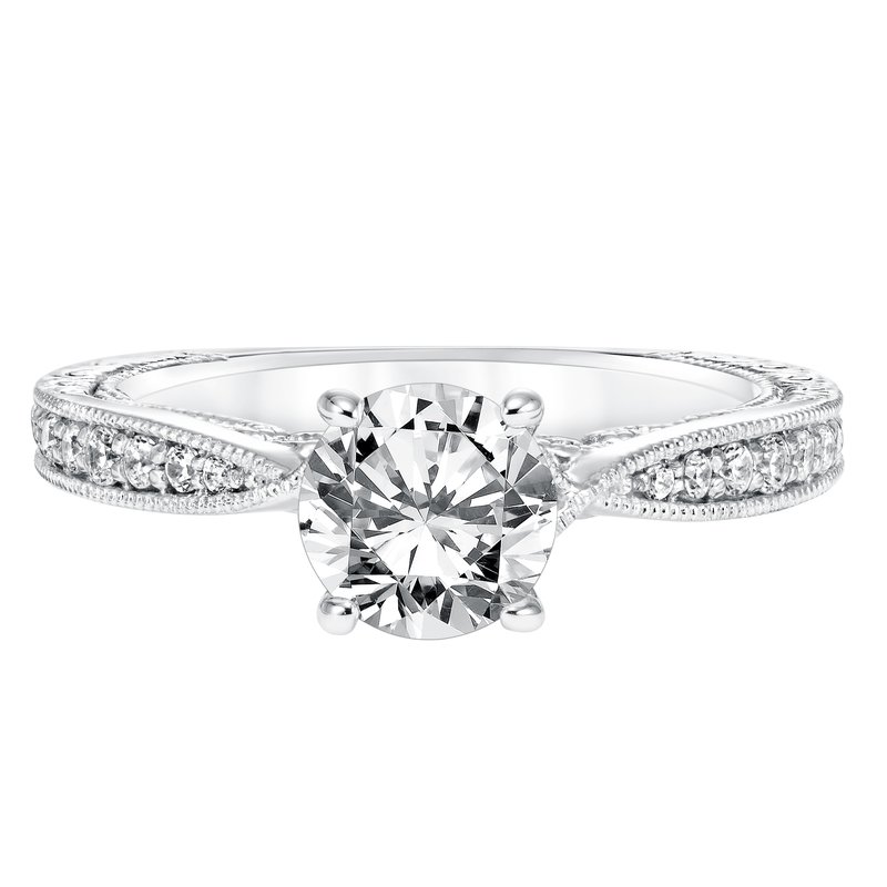 Diamond Prong Set Engagement Ring with Pinched Engraved Diamond Shank and Milgrain Detail