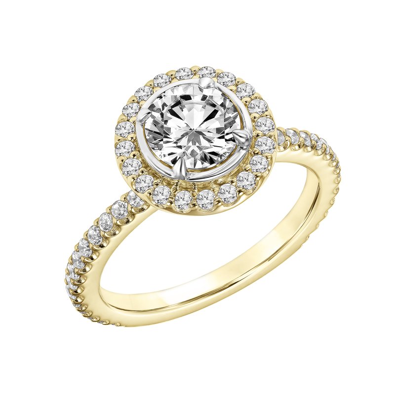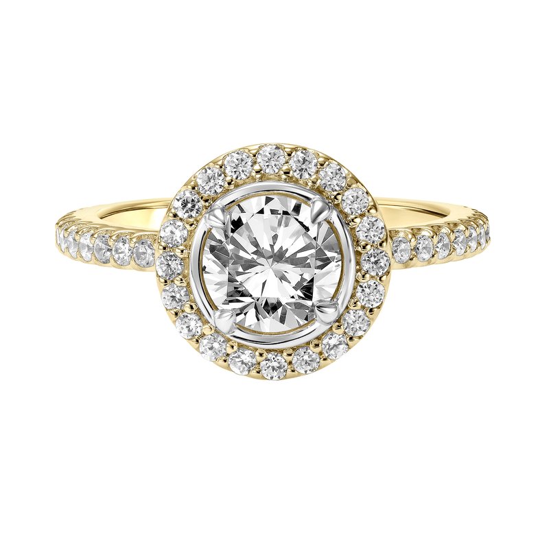 Diamond Halo Engagement Ring with Bezel Set Center and Diamond Shank
