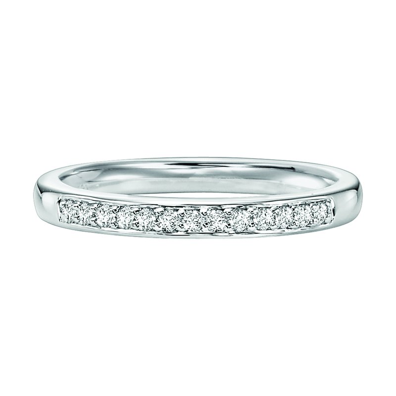 Wedding band with round, bead set diamonds.