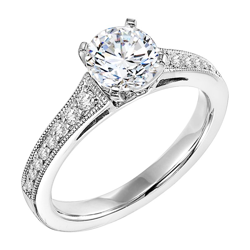 This engagement ring features a round center stone and graduating prong set diamond band with milgrain for alluring heirloom style