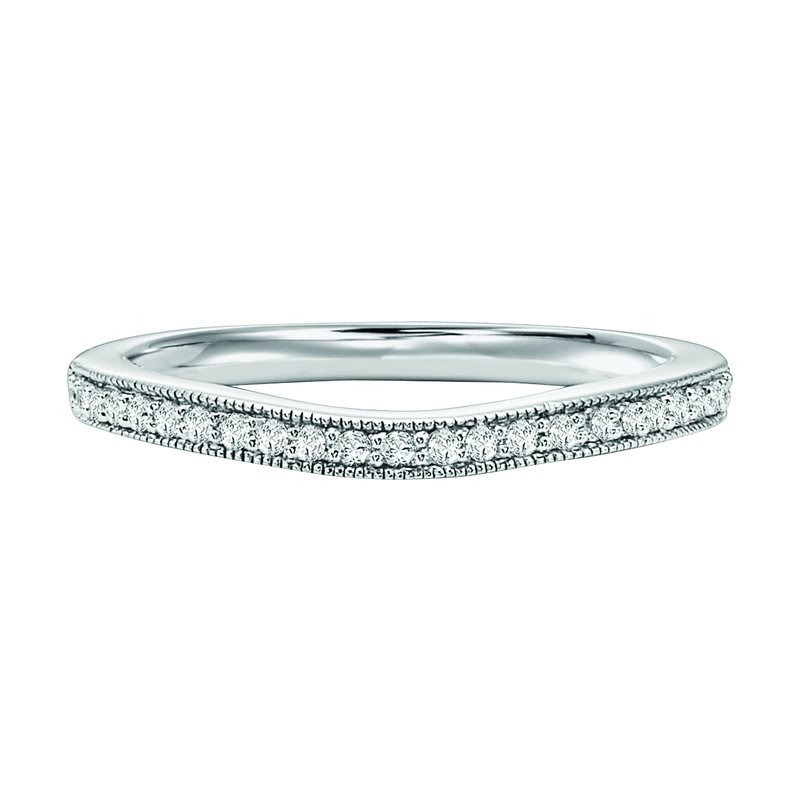 Wedding band with bead set diamonds and milgrain designed to fit flush to matching engagement ring.