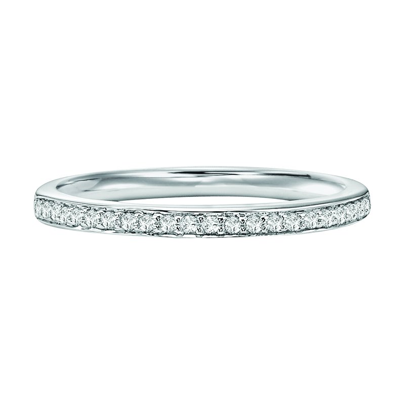 Wedding band with round, bead set diamonds halfway around.