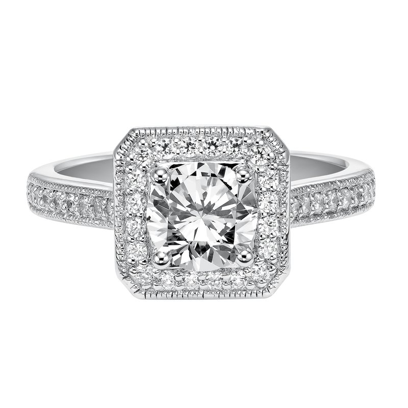 This striking vintage inspired diamond halo engagement ring features a delicately designed diamond and milgrain band