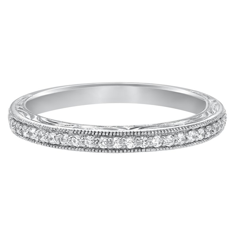 Wedding band with bead set, round diamonds, milgrain and engraving.