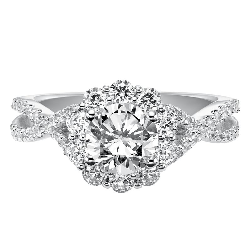 Awe-inspiring sparkle illuminates from this engagement ring featuring a shared prong set diamond halo and elegant twisted diamond band for grand effect.