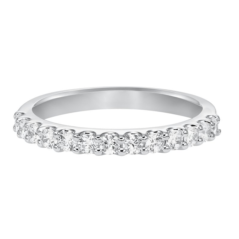 Wedding band with round diamond, shared prong shank
