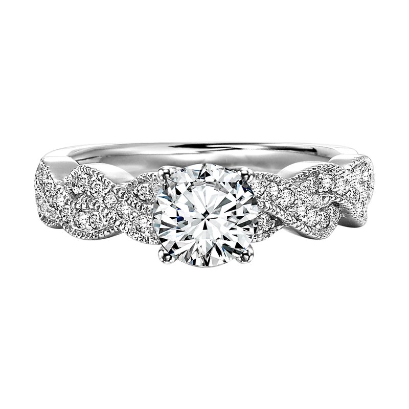 This finely crafted diamond prong set ribbon twist band with milgrain looks lovely as it accentuates the center stone