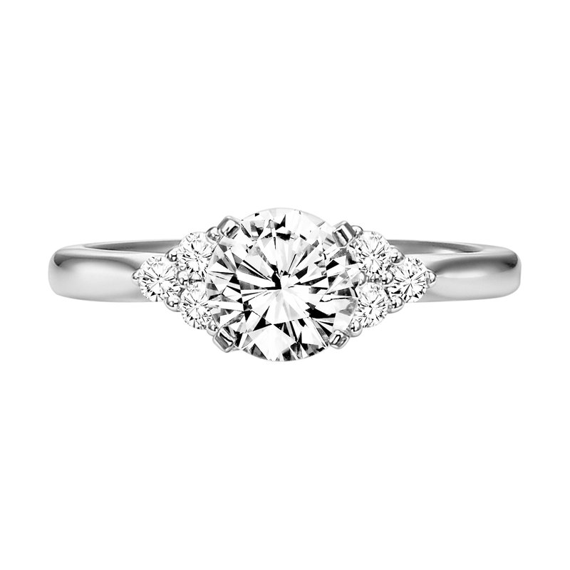 Timeless in design, this engagement ring features a round center stone accented by a striking 3-stone diamond cluster on each side along with a high polished band