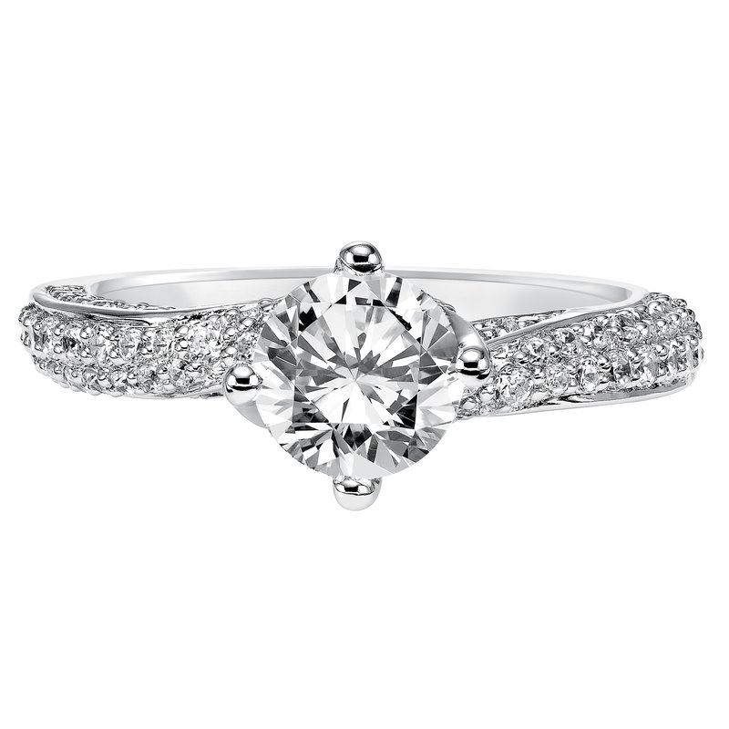 Gorgeous curves of diamond pave grace the band of this diamond engagement ring for a romantic look