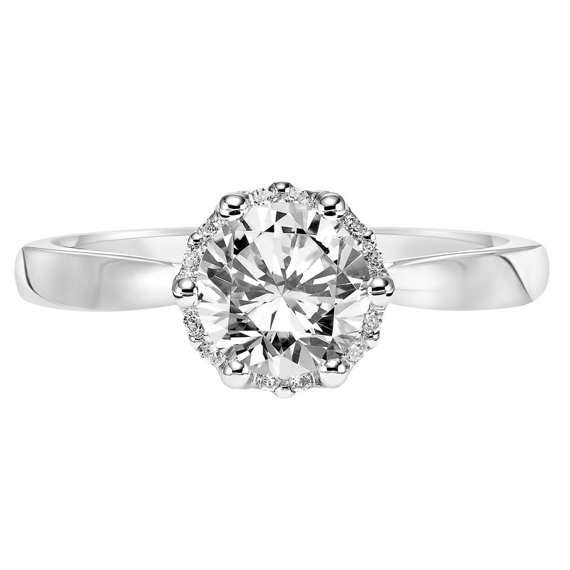 Classic glamour inspired the design of this engagement ring featuring a round diamond brilliantly accentuated by a prong set diamond halo and high polished band
