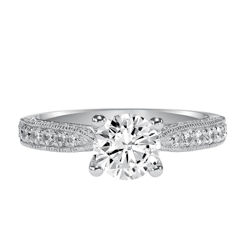 Milgrain detailing accents the diamond prong set band of this magnificent engagement ring
