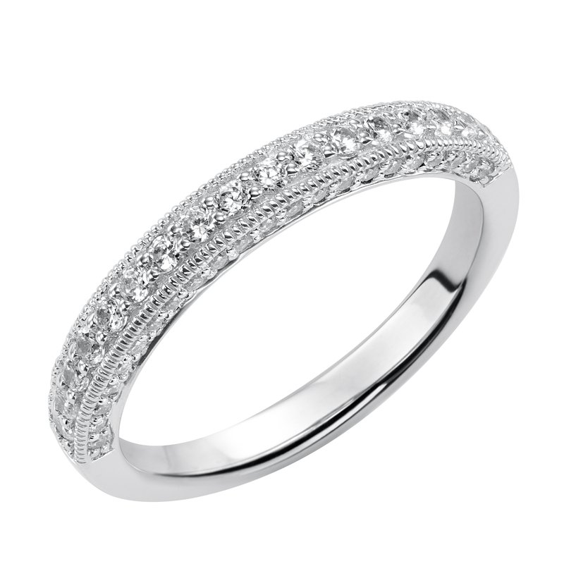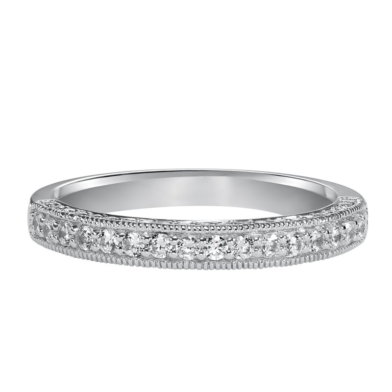 Wedding band with multi-row, bead set round diamonds and milgrain.