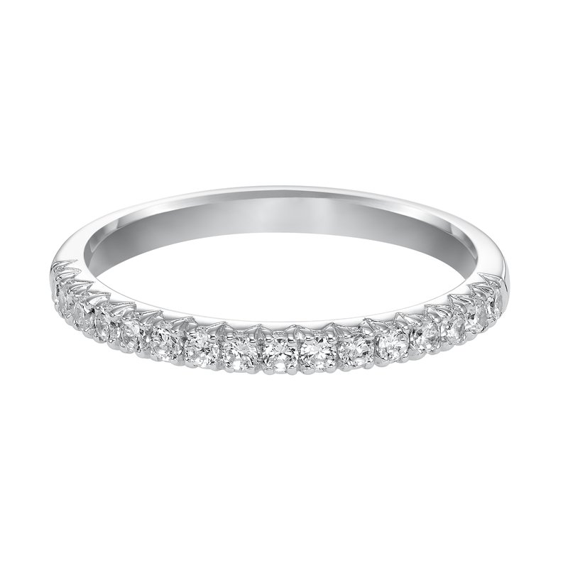 Wedding band with shared prong set, round diamonds.
