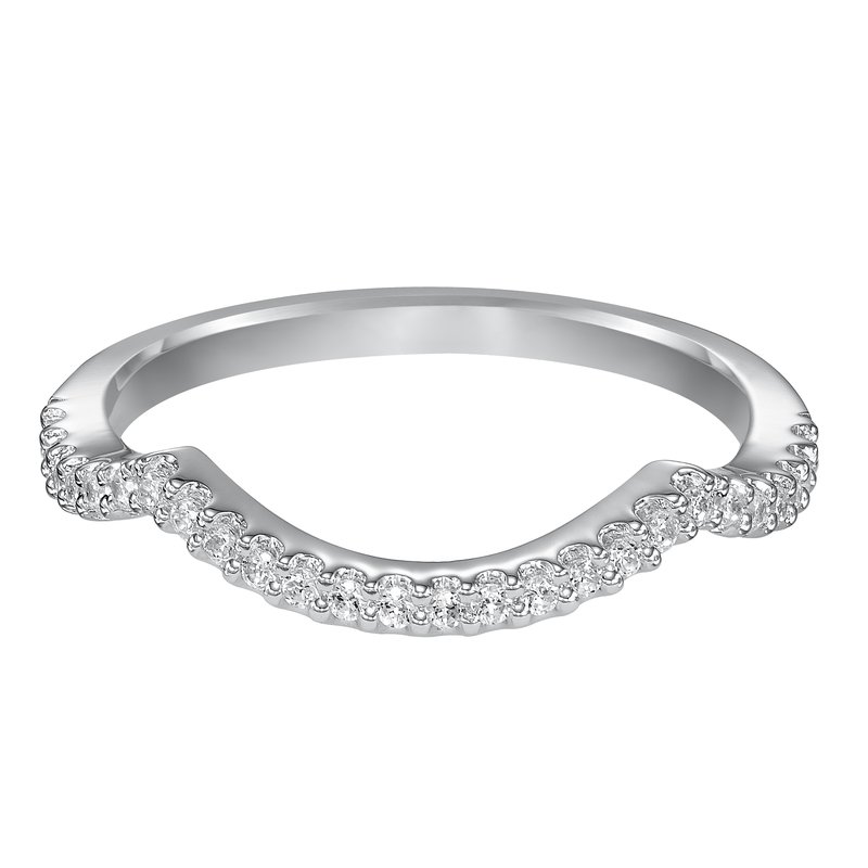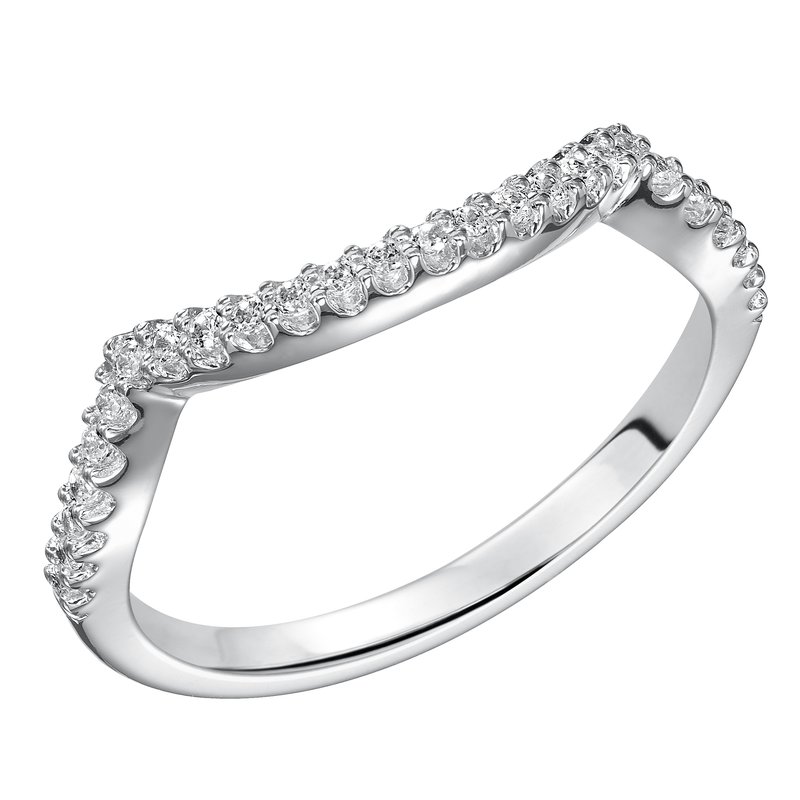 Wedding band with shared prong set, round diamonds and curved design to fit flush with matching engagement ring.
