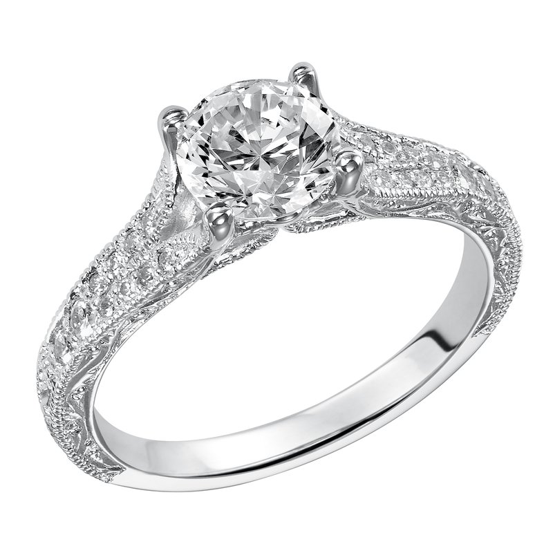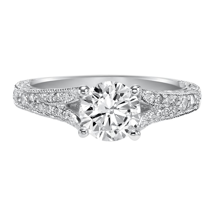 This vintage chic inspired design features a diamond prong set split band with delicate engraving and milgrain accents