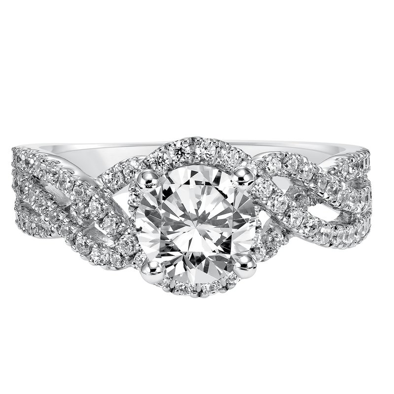 Shimmer and sparkle with this modern woven free form engagement ring featuring prong set diamonds gracing the band