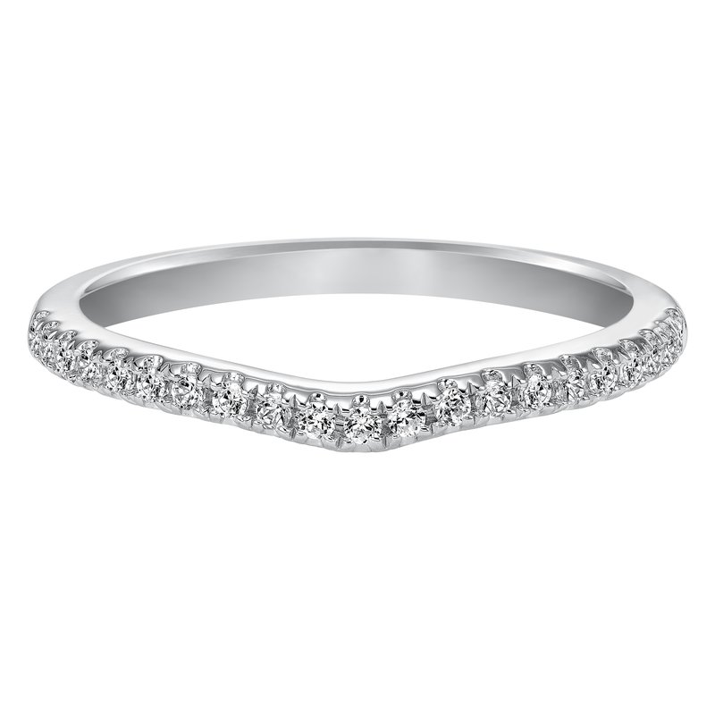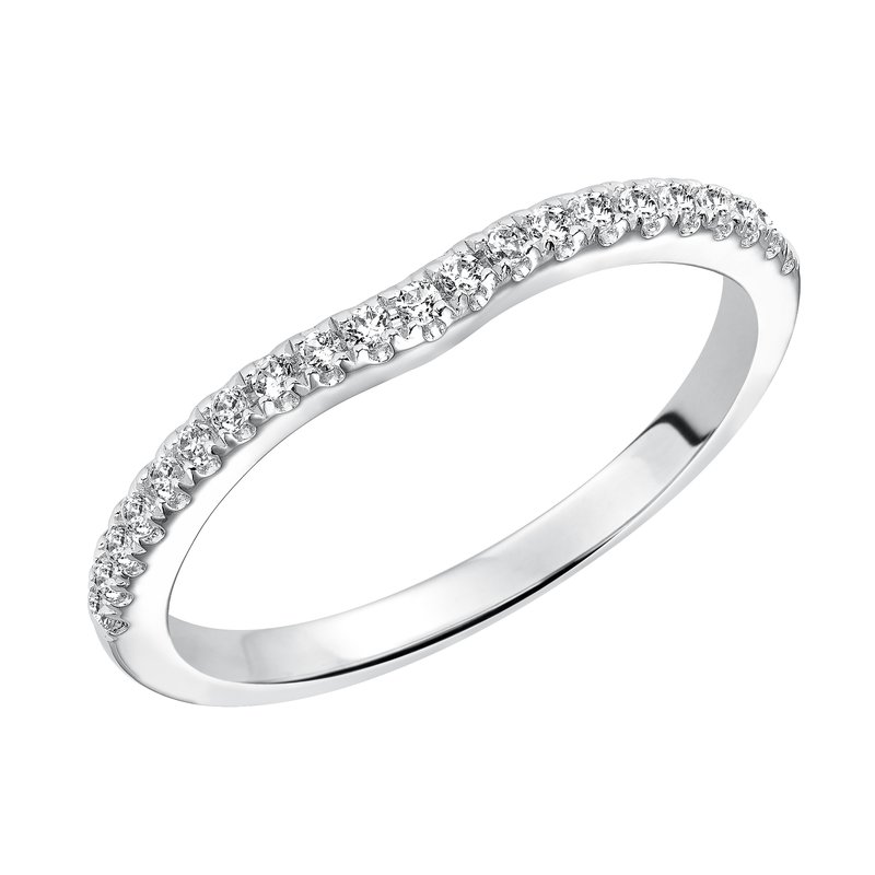 Wedding band with prong set, round diamonds and curved to fit flush with matching engagement ring.