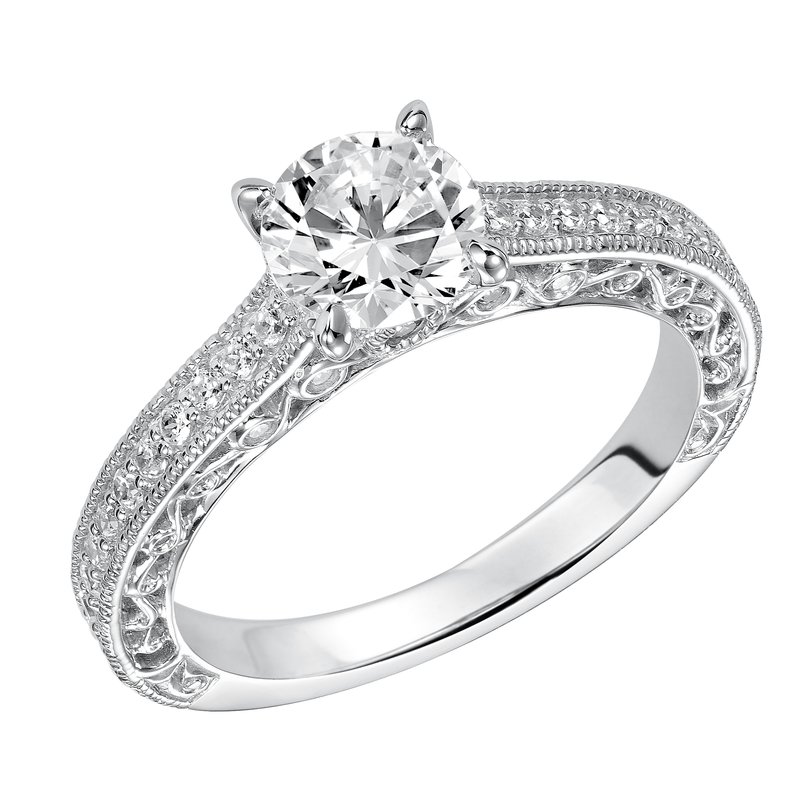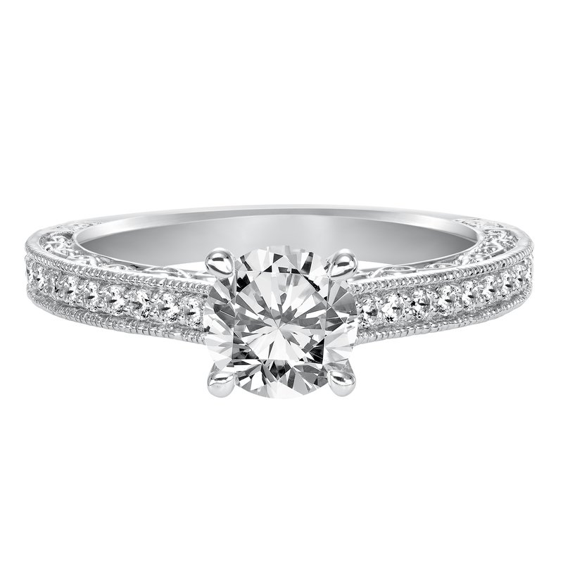 This round brilliant diamond is complimented by stunning diamond prong set and filigree band
