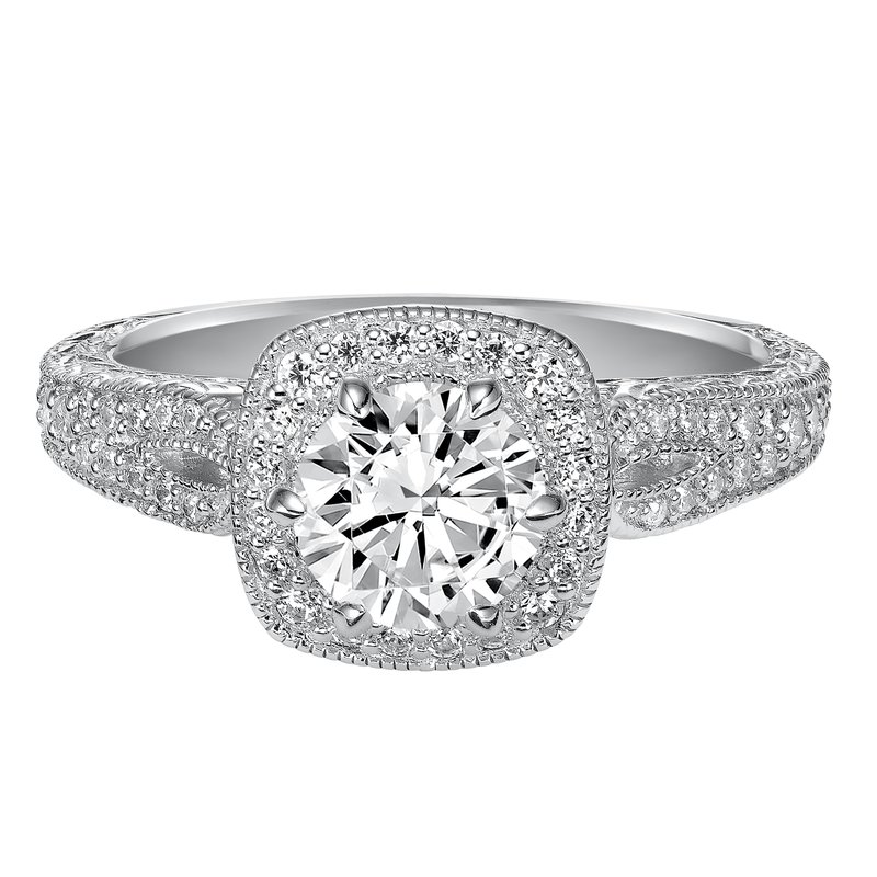 Modern meets vintage with this beloved engagement ring featuring a stunning prong set diamond halo and band with milgrain details and an engraved design