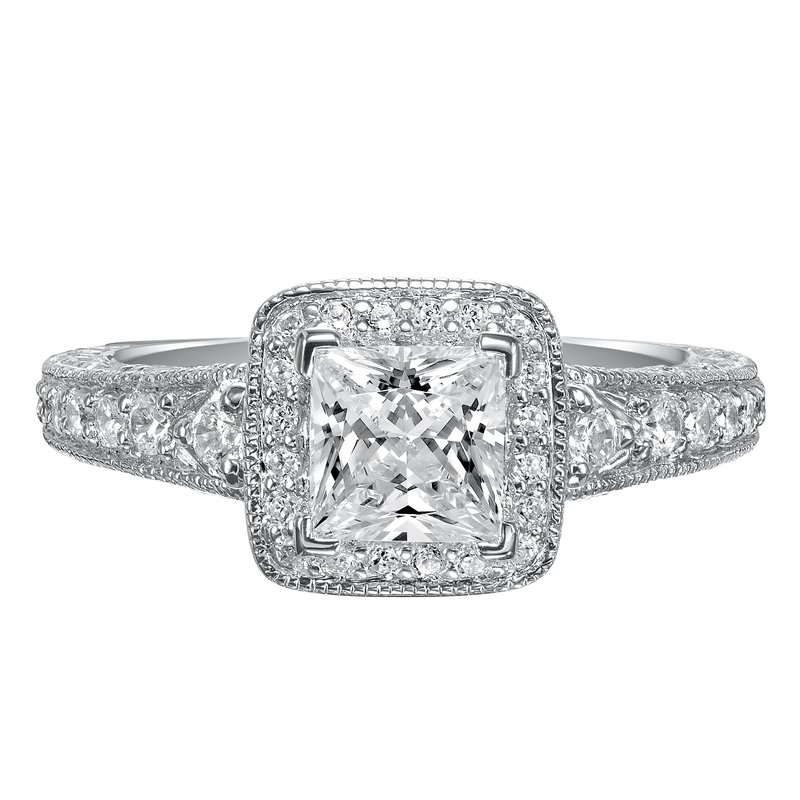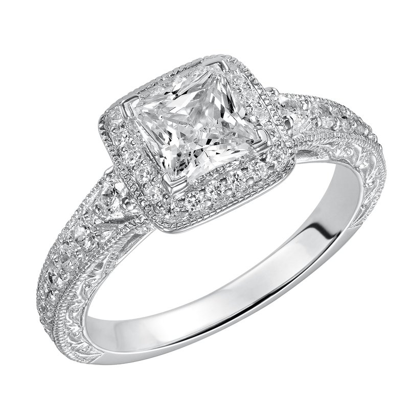 This princess cut diamond engagement ring is awe-inspiring with an impressive diamond prong set band with a intricate engraved design and milgrain detailing