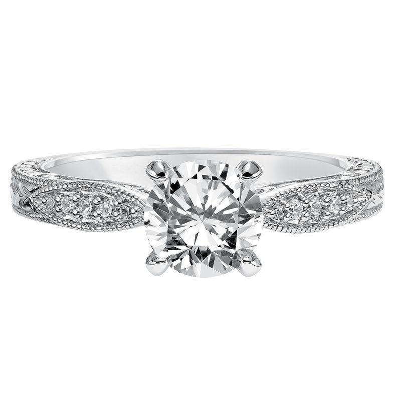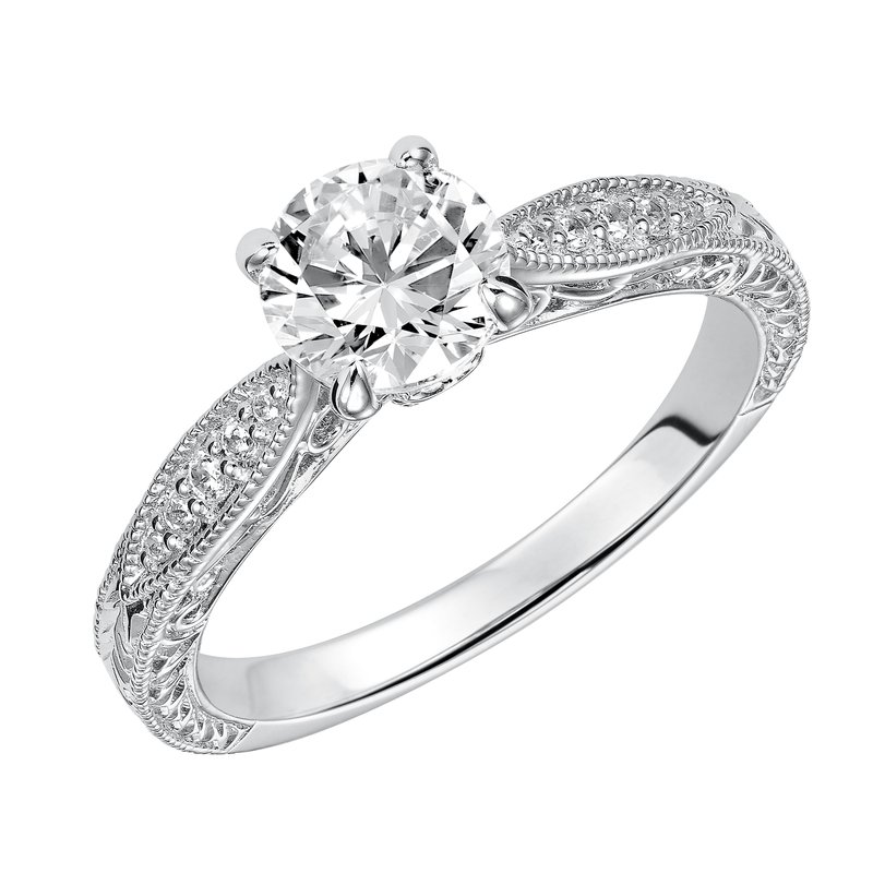 Absolutely exquisite with its intricate design, this round diamond engagement ring features a diamond prong set band with a gorgeous engraved design with milgrain details