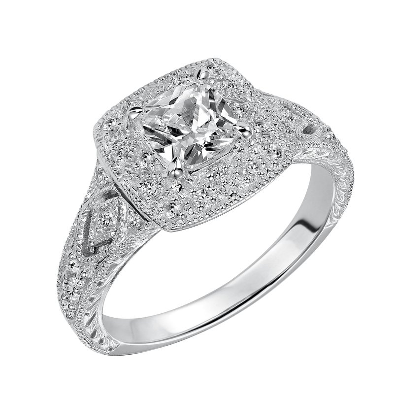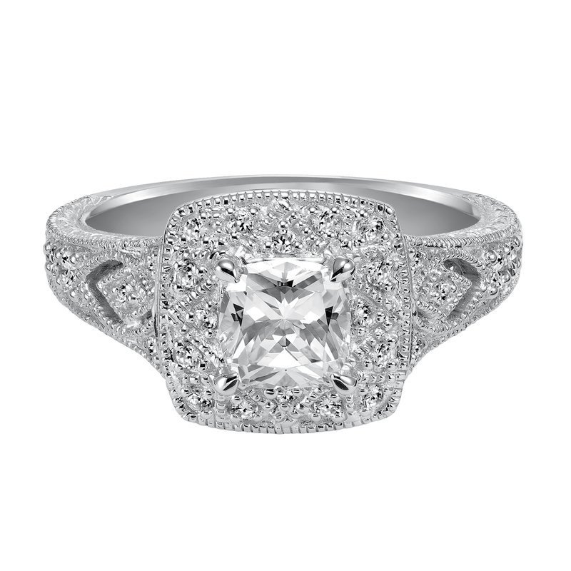 This cushion cut diamond engagement ring features a beautifully dramatic diamond prong set halo and band enhanced with engraving and milgrain