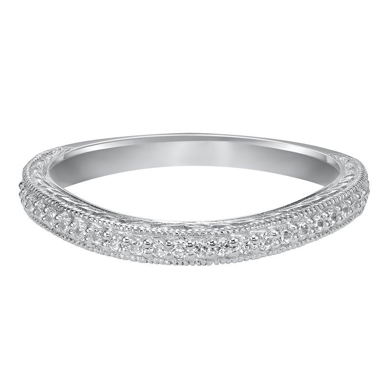 Wedding band with bead set, round diamonds, milgrain, engraving and curved design to fit flush with matching engagement ring.