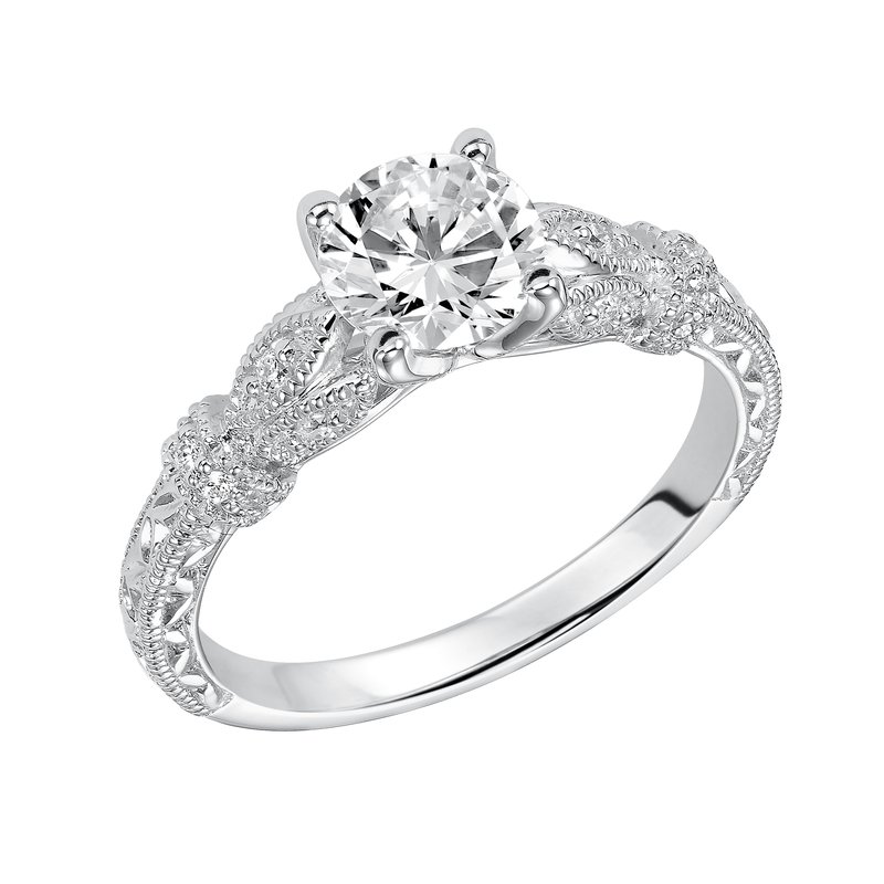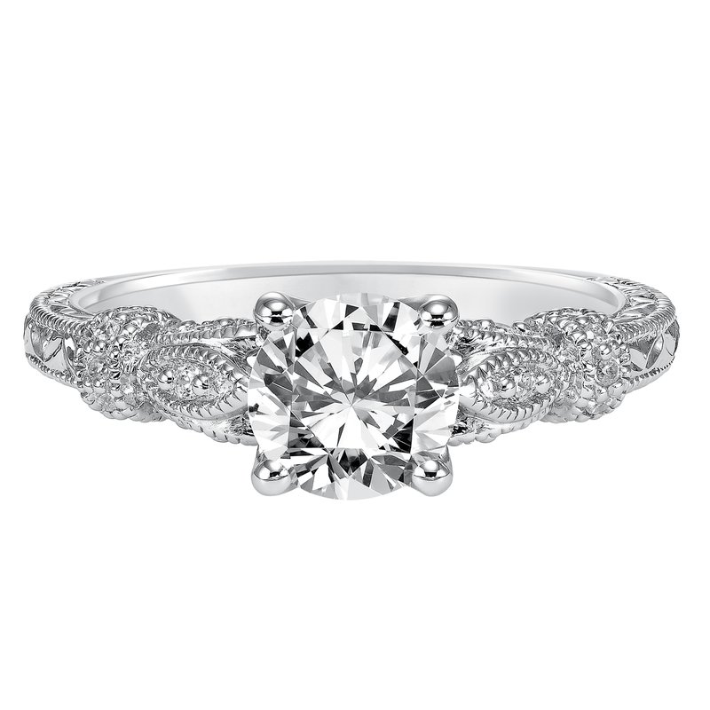 Featuring a round center diamond, this engraved and diamond prong set band with milgrain is absolutely breathtaking