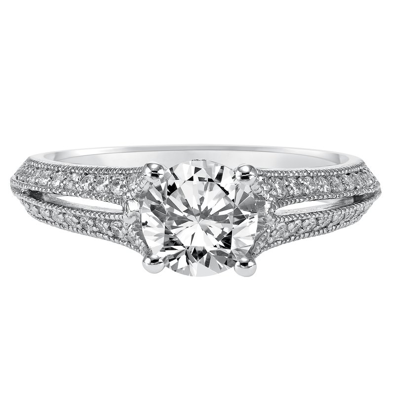 Classic heirloom style inspired this engagement ring with its prong set diamond split band with milgrain