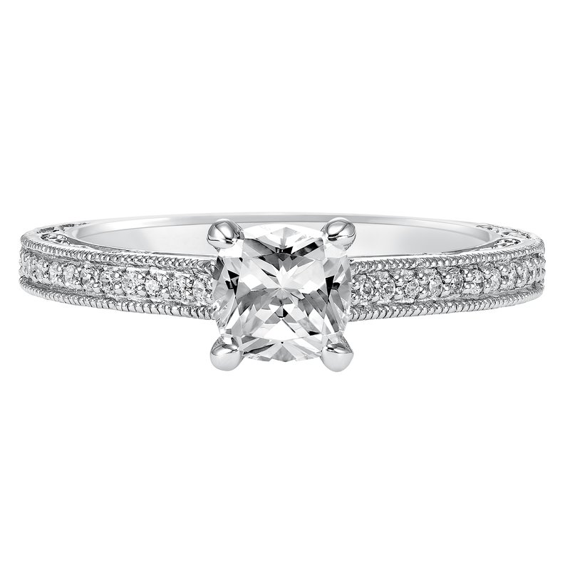 This charming cushion cut engagement ring features an exquisite prong set diamond band enhanced with milgrain and intricate filigree