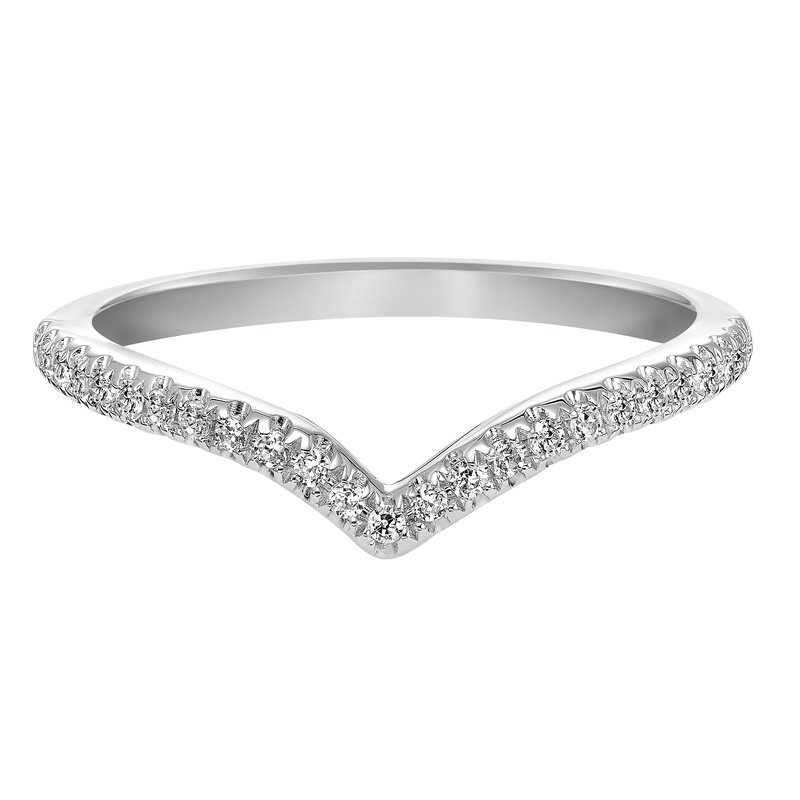 Wedding band with pave set, round diamonds and curved to fit flush with matching engagement ring.