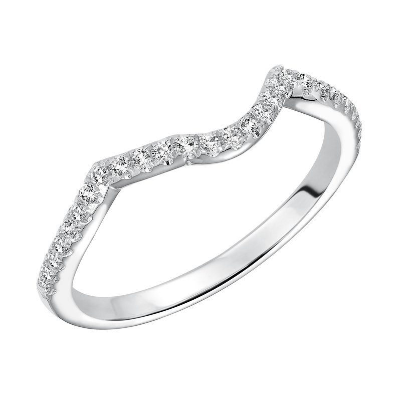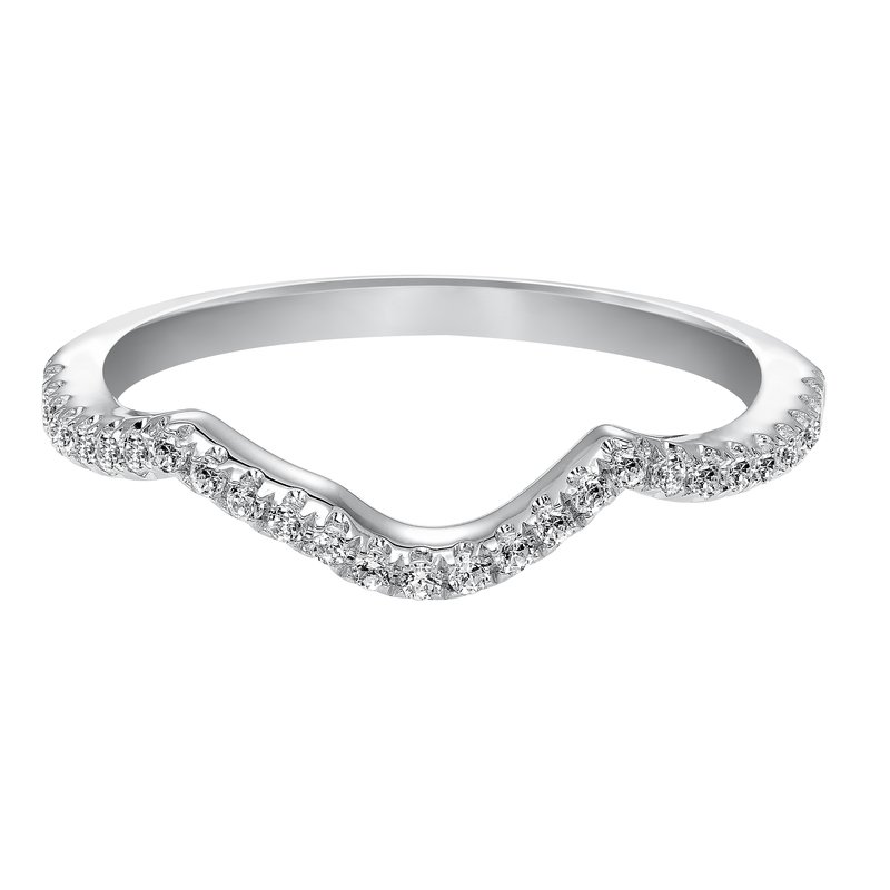Wedding band with pave set, round diamonds and curved to fit flush with matching engagement ring.