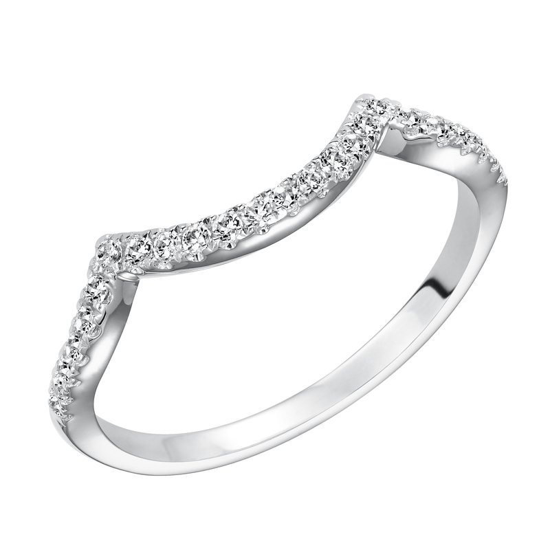 Wedding band with pave set, round diamonds and curved to fit flush with matching engagement ring.