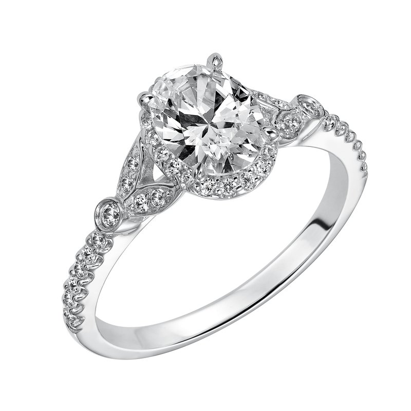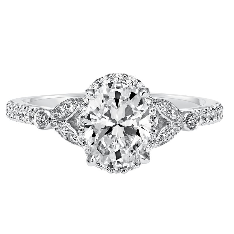 This romantic and beautiful engagement ring features an oval cut diamond accentuated by a prong set diamond halo and petal-inspired band design