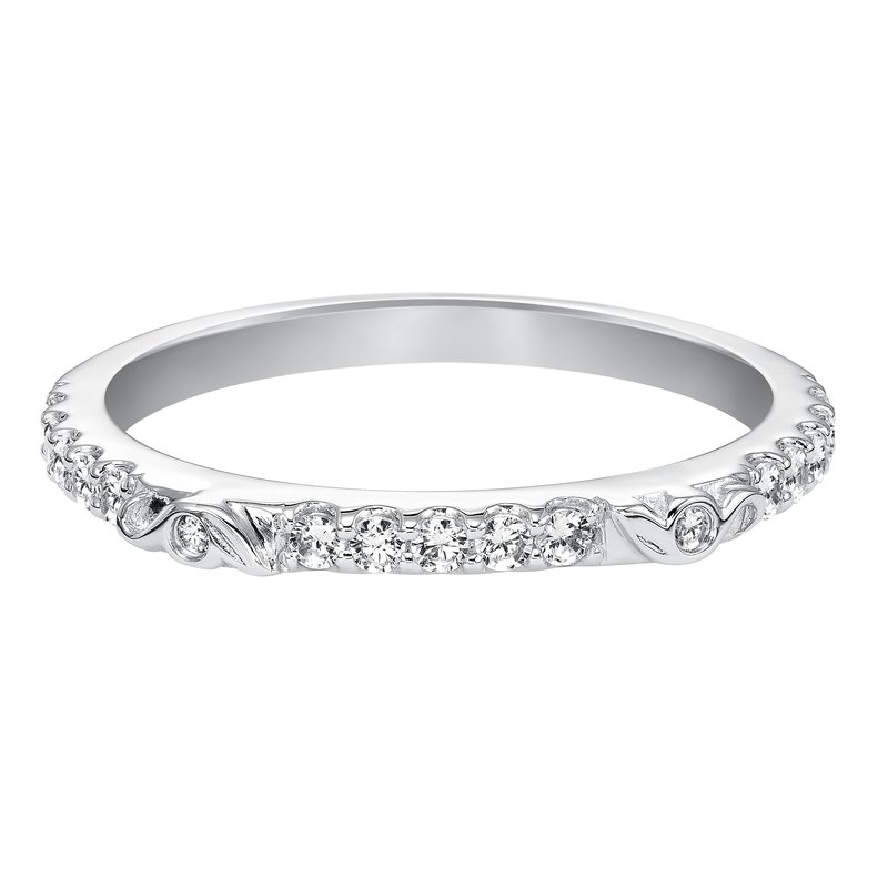 Wedding band with prong set, round diamonds and designed to fit flush with matching engagement ring.