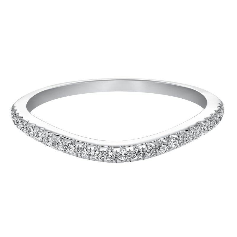 Wedding band with pave set, round diamonds and curved to fit flush with matching engagement ring.