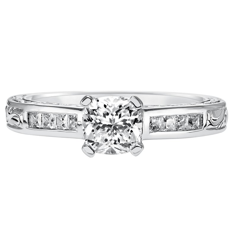 This gorgeous cushion cut diamond is accentuated by a sophisticated channel set diamond band, with delicate filigree and engraving
