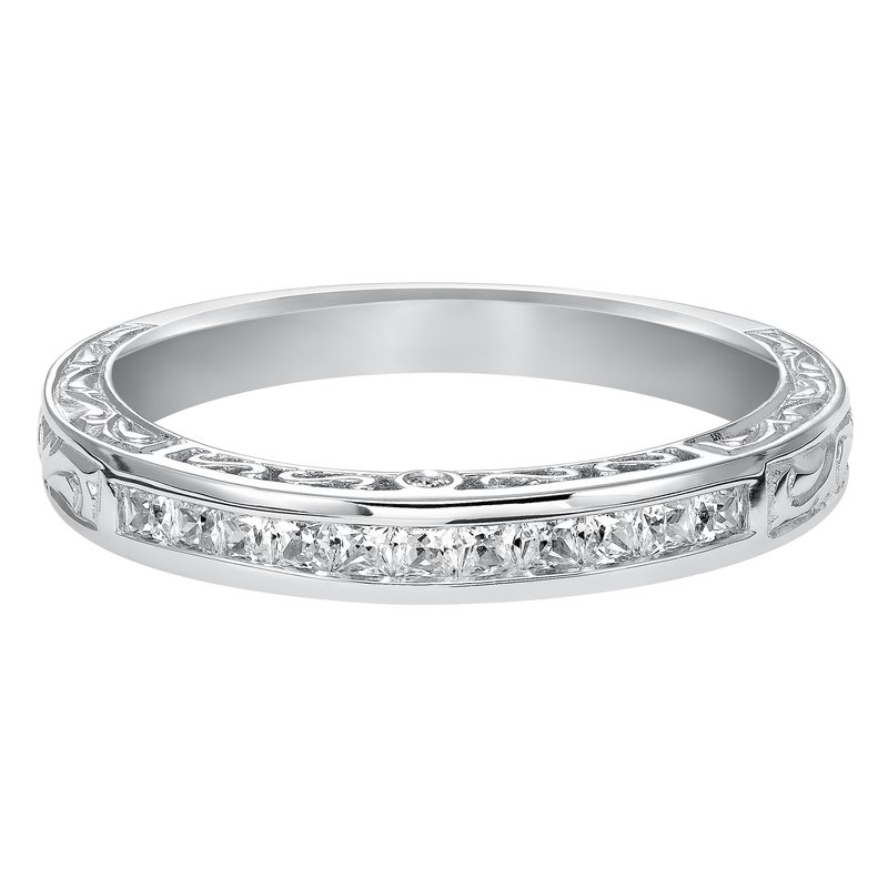 Wedding band with channel set, princess cut diamonds and engraved design.